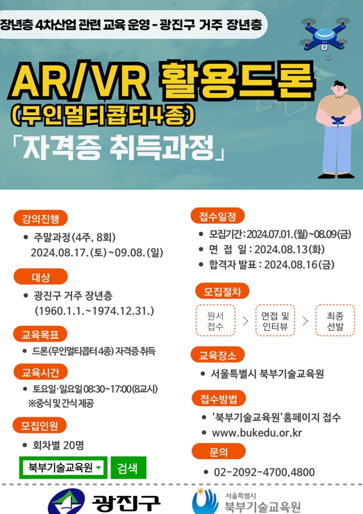 다음 달 9일까지 서울시 북부기술교육원 누리집www.bukedu.or.kr)에서 1기 과정 20명을 모집한다. 광진구에 거주하는 장년층(1960년생 ~ 1974년생)이면 누구나 드론 교육을 신청할 수 있으며, 접수 마감 후 면접 및 인터뷰를 거쳐 최종 교육생이 선발된다.