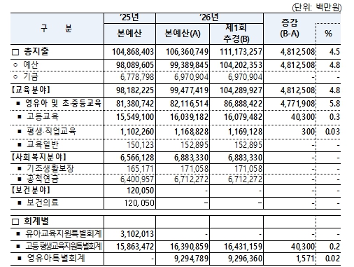 2026년 제1회 교육부 추가경정예산의 세부 내용은 다음과 같다.