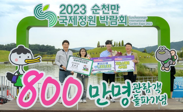 15시 19분 국가정원 동문으로 입장한 800만 번째 입장객은 광주에서 온 20대 커플이었다. 조직위는 행운의 입장객과 함께 800만 돌파를 기념해 조성한 꽃탑 제막식을 가진 뒤 떡케이크 커팅식을 진행했다. 노관규 이사장(순천시장)은 800만 번째 입장객에게 순천만국가정원 평생 무료 입장권을, 정병회 의장은 가든스테이 ‘쉴랑게’ 숙박권을 증정했다. 아울러 정원박람회 성공 개최를 위해 앞장서 온 일류순천 시민운동본부에서도 순천사랑상품권 100만 원을 후원해 전달했다.