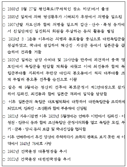 또한, 1920년 일제의 독립군 탄압 계획 등에 맞서 독립군부대를 지휘, 일본군 대부대를 무찌른 봉오동전투와 청산리대첩을 승전으로 이끌었다.