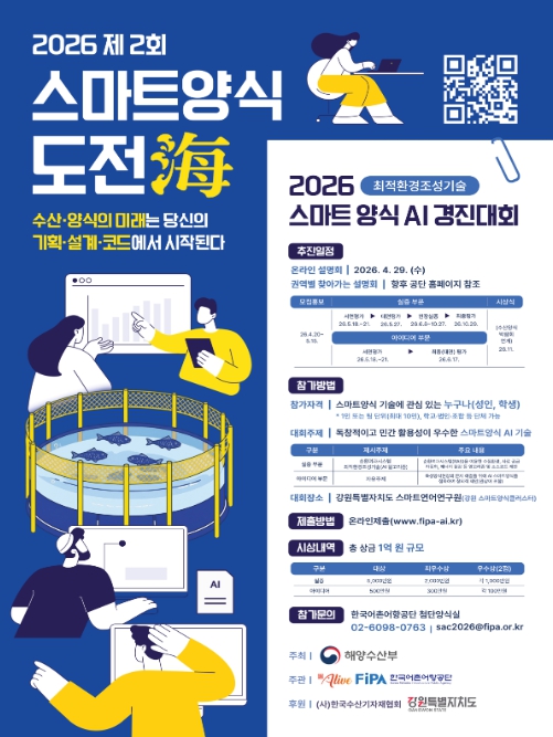 [뉴스힘=박노신 기자] 해양수산부와 한국어촌어항공단(이사장 홍종욱)은 오는 4월 20일부터 5월 15일까지 ‘제2회 스마트양식 도전해(海) 경진대회’의 공모를 실시한다고 밝혔다.