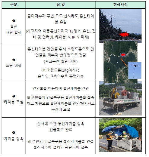 현장 사례와 이번 훈련을 통해 집중호우에 의한 산사태, 지반침하 등으로 인력과 장비 진입이 어려운 지역에 드론으로 통신케이블 인계선을 사고구간 횡단비행을 통해 전달하여 통신케이블을 견인하고 포설할 수 있어, 통신서비스 장애지역의 긴급복구 시간을 대폭 감소시킬 수 있으며 작업자의 안전성도 확보할 수 있는 것으로 확인됐다.