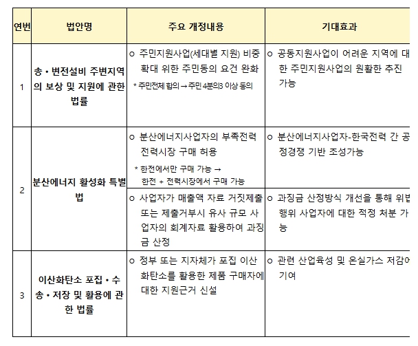 [뉴스힘=박노신 기자] 기후에너지환경부는 △‘송‧변전설비 주변지역의 보상 및 지원에 관한 법률’, △‘분산에너지 활성화 특별법’ 등 3개 법 개정안이 11월 13일 국회 본회의를 통과했다고 밝혔다. 개정안별 주요내용은 다음과 같다.