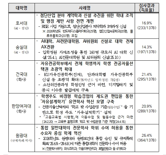 올해에는 '고등교육법 시행령'과 '대학설립·운영 규정' 개정 등 그간의 규제 개선* 내용을 토대로, 첨단 분야 계약학과 및 입학 정원 증원 등을 활용한 첨단 분야 학과 신설, 소단위 전공 과정과 연계한 전공자율선택제 확대 등 다양한 대학 혁신 사례들이 응모됐다. 1단계 전문가 평가 후 일반 국민들의 체감도를 반영하기 위한 2단계 온라인 국민심사(12.8~12.10., 소통24 온라인 투표)를 실시하여, 최종 5개 대학을 선정했다.