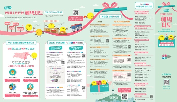 ‘2026 언제나 든든한 혜택지도’는 동주민센터, 복지관 등 주민 이용시설에 비치되며, 중구 홈페이지와 블로그에도 게재돼 언제든지 쉽게 찾아볼 수 있다.