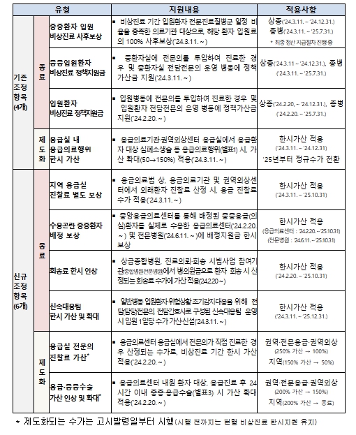 정부는 중증·응급의료체계 유지와 진료 공백 최소화를 위해 건강보험에서 10가지 항목을 지원했으며, 이 중 4개 항목은 그간 ‘25년 병·의원 상대가치점수 연계·조정, 상급종합병원 구조전환 시범사업(’24.10~) 및 포괄 2차 종합병원 지원사업(’25.7.~) 추진 등과 연계하여 정규수가 전환 또는 지원 종료 등 이미 조정된 바 있다.