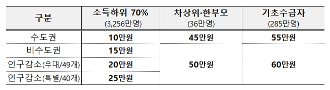 소득 하위 70% 국민에게 거주 지역별로 수도권 10만원, 비수도권 15만원, 인구감소 우대지역 20만원, 인구감소 특별지역 25만원을 지급할 예정이며, 한부모가족・차상위계층은 45만원, 기초생활수급자는 55만원을 지급하되 비수도권에 거주하는 경우에는 1인당 5만원을 추가 지급한다.