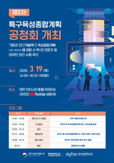 [뉴스힘=박노신 기자] 과학기술정보통신부는 2026년 3월 19일 14시 30분, 대전에서(인터시티호텔, 머큐리 A홀) 제5차 연구개발특구육성 종합계획 공청회를 개최한다.