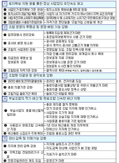 사업이 완료된 조합은 1년 이내 해산총회 개최를 의무화하고 정당한 사유없이 미해산 시 지자체가 직권으로 해산할 수 있는 근거도 마련한다.