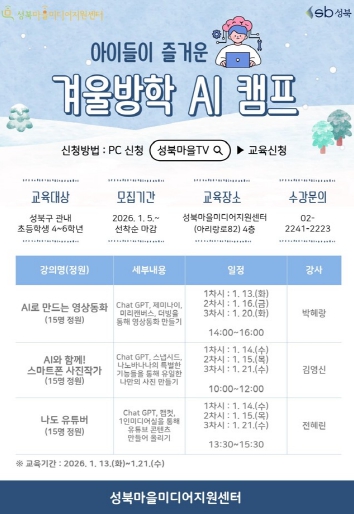 [뉴스힘=박노신 기자] 서울 성북구 성북마을미 디어지원센터가 오는 13일부터 21일까지 미디어 체험 프로그램인 ‘겨울방학 AI 캠프’를 운영한다.
