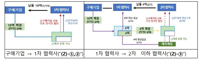 상생결제는 대기업 등 구매기업이 1차 협력사에 지급한 납품대금이 2차 이하 협력사로 안전하게 지급되도록 하는 결제방식으로, 협력사는 결제일에 현금지급을 보장받고, 구매기업의 높은 신용도를 활용해 낮은 금리로 조기 현금화가 가능한 장점도 있다.