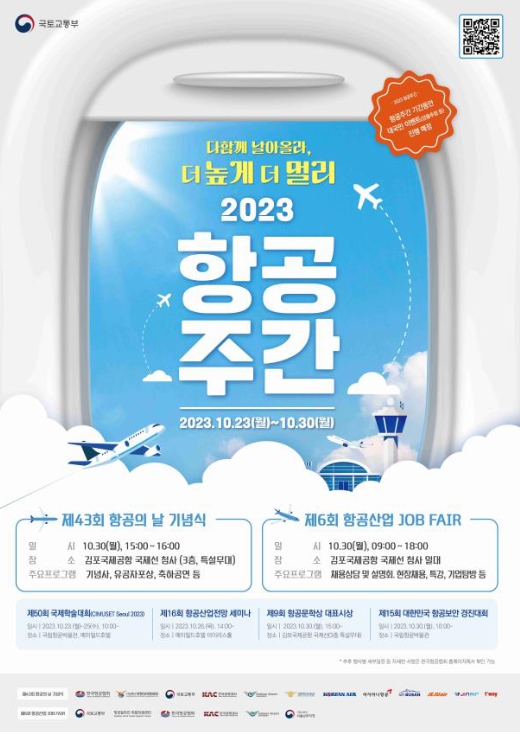 [뉴스힘=박노신 기자] 국토교통부는 제43회 항공의 날(10.30.)을 맞아 오는 10월 23일부터 10월 30일까지 8일간을 「항공주간」으로 지정하여 기념식과 연계하여 다양한 행사를 개최한다고 밝혔다.