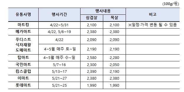 오프라인 할인행사는 전국 8개 마트에서 4월 22일부터 5월 31일까지 한돈 삼겹살, 목살을 최대 30% 이상 할인된 가격에 판매한다.