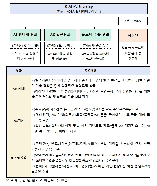 K-AI Partnership 공동의장은 KOSA 조준희 협회장과 네이버클라우드 김유원 대표가 맡았으며, ▲AI 생태계 경쟁력 강화 ▲AX 확산 ▲AI 풀스택 수출을 위한 3개 분과를 운영한다.