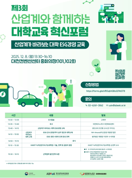 [뉴스힘=박노신 기자] 교육부는 한국공학교육인증원(원장 김우승), 대전테크노파크(원장 김우연) 대전 라이즈센터와 함께 12월 8일(월), 대전컨벤션센터에서 ‘제3회 산업계와 함께하는 대학교육 혁신포럼’을 개최한다.