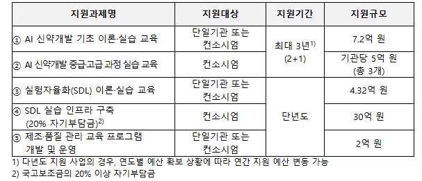 이번 공모를 통해 최대 7개 수행기관을 선정하며, 지원기간은 과제별로 구분하여 지원한다. 지원과제는 AI 신약개발 기초 이론·실습 교육, 중급·고급 과정 실습 교육, 실험자율화 이론·실습 교육, 실험자율화 실습 인프라 구축, 제조·품질 관리 교육까지 총 5개 단위이다.
