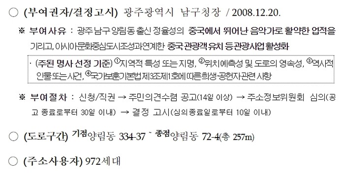 [뉴스힘=박노신 기자] 행정안전부는 광주광역시 남구 양림동 일부 도로에 부여된 ‘정율성로’ 도로명 변경을 광주광역시 남구에 시정 권고한다고 밝혔다.
