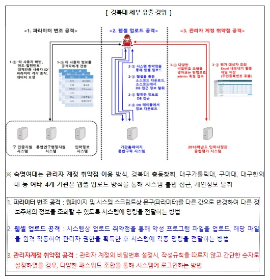 작년 11월 경북대학교 측으로부터 개인정보 유출신고를 접수받아 조사한 결과, 경북대학교 소속 학생 2명이 ’21.8월부터 학교 시스템 보안 취약점을 악용해 파라미터 변조(매개변수 위조), 웹셸(악성코드) 업로드, 관리자계정 취약점(비밀번호 관리 소홀) 이용 등 다양한 방법으로 여러 시스템에 무단 접속했고 이후 유사한 방법으로 학교 관련 단체나 주변 대학으로 공격 범위를 확대해 나간 사실을 확인했다.