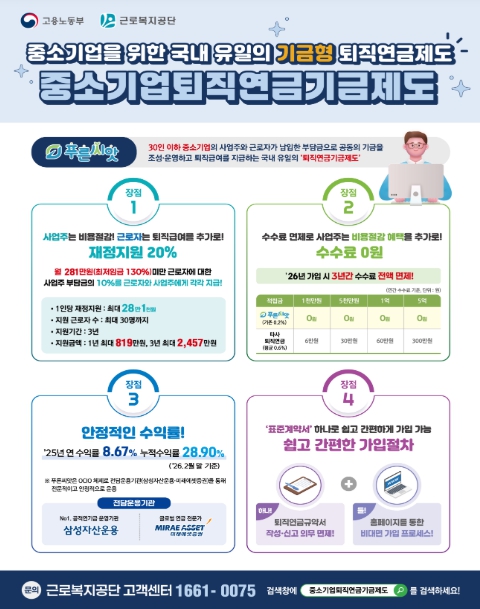 이와 함께 최근'근로자퇴직급여보장법'개정에 따라 오는 7월 1일부터는 가입 대상이 기존 30인 이하 사업장에서 50인 미만 사업장으로 확대되고 2027년부터는 100인 미만 사업장까지 단계적으로 확대될 예정이다.