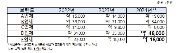 또한 출점 신화를 써 내려가고 있는 커피 프랜차이즈 D사는 지난해 평균 차액 가맹금이 약 4,800만 원으로, 가맹점당 평균 매출액 대비 차액가맹금이 12.56%에 달했다. 커피 프랜차이즈 업계 평균(6.8%)의 약 2배 수준이다.