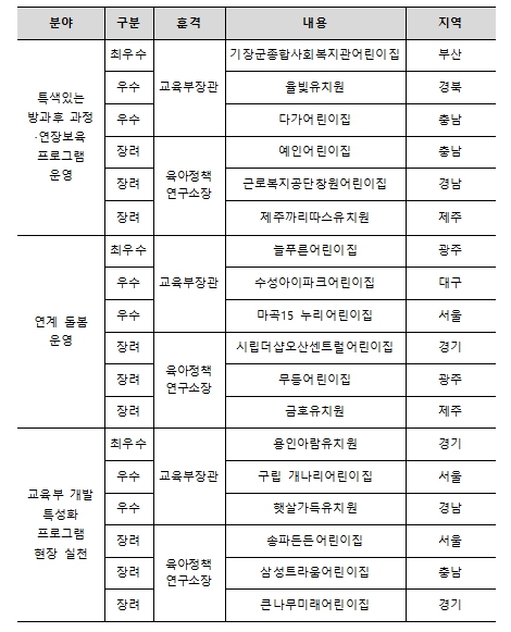 수상작은 각 분야별로 최우수상 1편(교육부장관상), 우수상 2편(교육부장관상), 장려상 3편(육아정책연구소장상)이 선정됐다. 이번 공모전에서는 지역 여건과 기관 특성을 반영하여 기획·운영한 맞춤형 프로그램이 우수사례로 평가받았다.