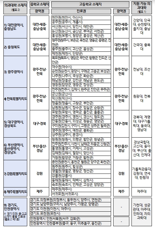 | ▲ 중·고교 소재지별 지원 가능 의과대학 |