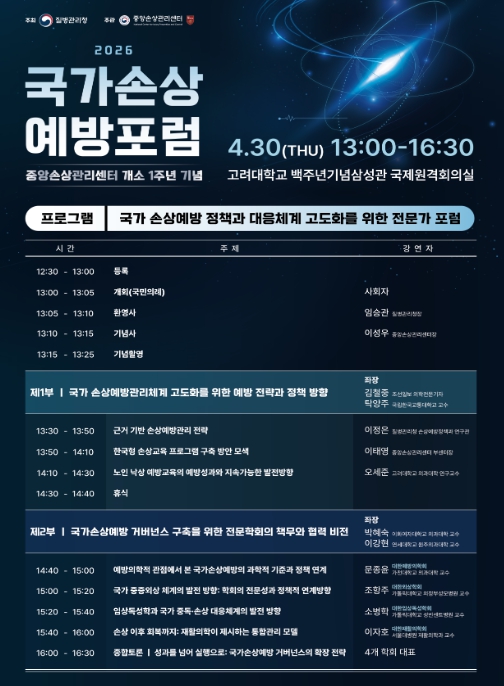 [뉴스힘=박노신 기자] 질병관리청은 중앙손상관리센터 개소 1주년을 맞아 4월 30일 고려대학교 백주년기념삼성관에서 「2026년 국가손상예방포럼」을 개최한다.