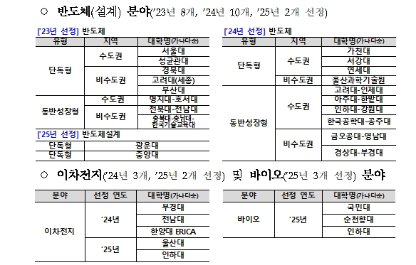 2025년에는 반도체 20개 사업단(30개교), 이차전지 5개교, 바이오 3개교를 대상으로 1,167억 원의 예산을 지원하여, 분야별로 대학의 역량과 강점에 기초한 특성화 인재양성 체계를 마련했다. 2026년에는 「국가첨단전략기술 지정 등에 관한 고시」 일부개정(’25.5.12.)에 따라 국가첨단전략기술에 새롭게 포함된 ‘로봇 분야’를 신설하여, 바이오 2개교 및 로봇 3개교를 선정하는 등 총 1,209억 원을 지원할 예정이다.