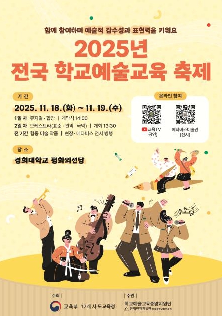 [뉴스힘=박노신 기자] 교육부와 17개 시‧도교육청은 11월 18일부터 11월 19일까지 경희대학교 평화의전당(서울)에서 2025년 전국 학교예술교육 축제를 개최한다.