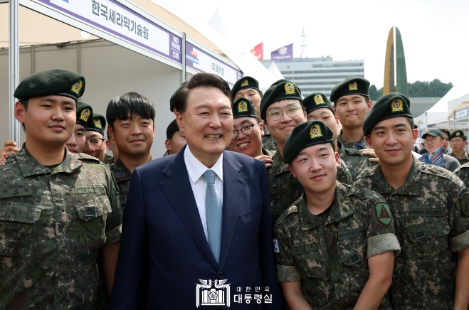 대통령이 박람회장 부스를 이동할 때마다 군복을 입은 장병들은 대통령 주변으로 몰려와 “충성”하며 거수경례했다. 대통령은 장병들에게 소속은 어디인지 물으며 한명 한명과 악수를 하면서 국가 안보를 위해 고생하는 장병들을 격려했다. 대통령은 또한 장병들의 사진 촬영 요청에 흔쾌히 응하며 즉석에서 기념 촬영을 했다. 이에 장병들은 대통령에게 “감사합니다”를 외치며 거수경례했다.