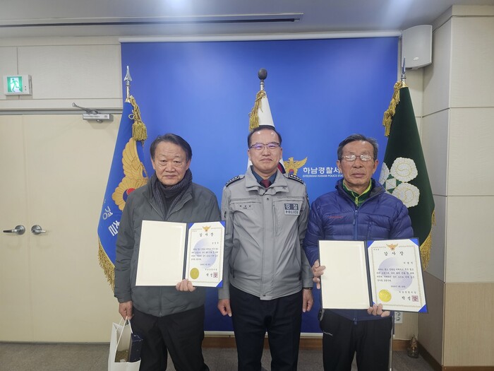 [뉴스힘=박노신 기자]경기남부경찰청 하남경찰서(서장 박성갑)은 주택밀집지역인 하남시 덕풍동 다세대주택 1층 싱크대 하부장에 연소중이던 가스버너를 넣어 화재가 발생한 것을 발견하고 진화하여 피해를 예방한 민간인 지모 씨와 강모 씨에게 감사장을 수여했다.