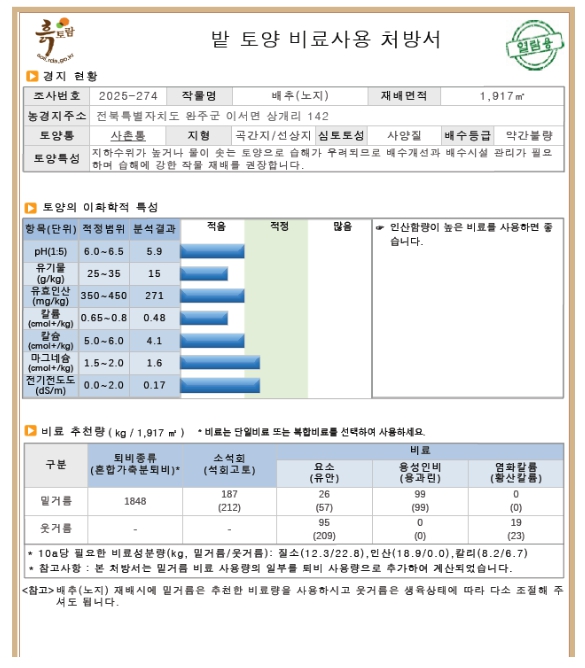 농촌진흥청은 토양환경정보시스템 ‘흙토람’에서 246작물의 비료사용처방서를 제공하고 있다. 작물을 아주심기(정식) 하기 전 토양을 채취해 가까운 농업기술센터에 분석을 의뢰하면 토양 양분 상태에 맞는 퇴비와 액비 사용량을 알려준다. 또한, 농가가 안심하고 퇴비, 액비를 사용할 수 있도록 농업기술센터에서 자가 퇴비의 부숙도와 액비 성분을 분석해 알려주고 있다.
