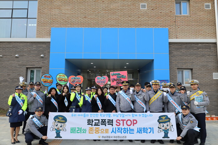 [뉴스힘=박노신 기자]하남경찰서는 10일 오전, 신학기를 맞아 지난 3일 새롭개 개교한 한홀중학교에서 학교폭력 예방을 위해 합동 캠페인을 실시했다.