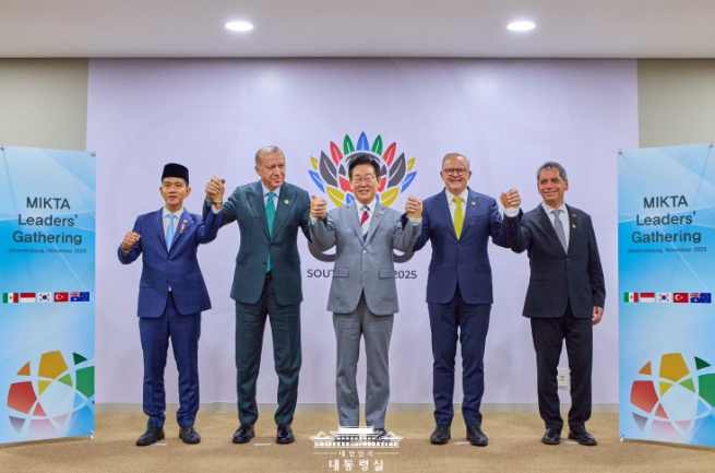 [뉴스힘=박노신 기자] 주요 20개국(G20) 정상회의 참석을 위해 남아프리카공화국을 방문한 이재명 대통령은22일(현지시간) 오후 우리나라, 멕시코, 인도네시아, 튀르키예, 호주 5개국으로 구성된 믹타(MIKTA) 회원국 정상들과 회동했다.